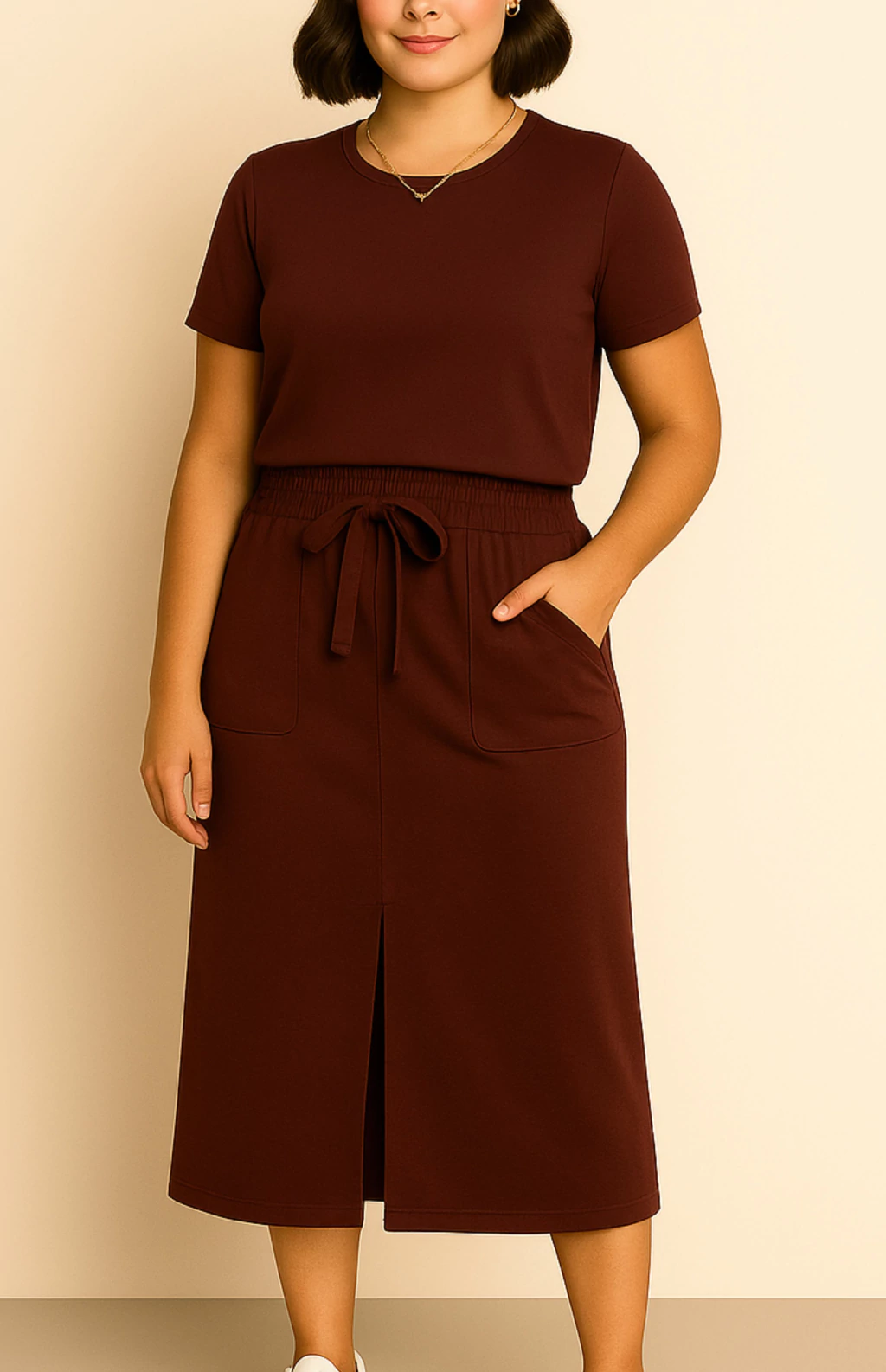 A parte de cima é uma blusinha de modelagem reta, com gola redonda e mangas curtas, trazendo um visual clean e moderno. A saia midi possui cós com elástico e amarração, bolsos frontais funcionais e fenda frontal, garantindo conforto ao caminhar e um caimento elegante.